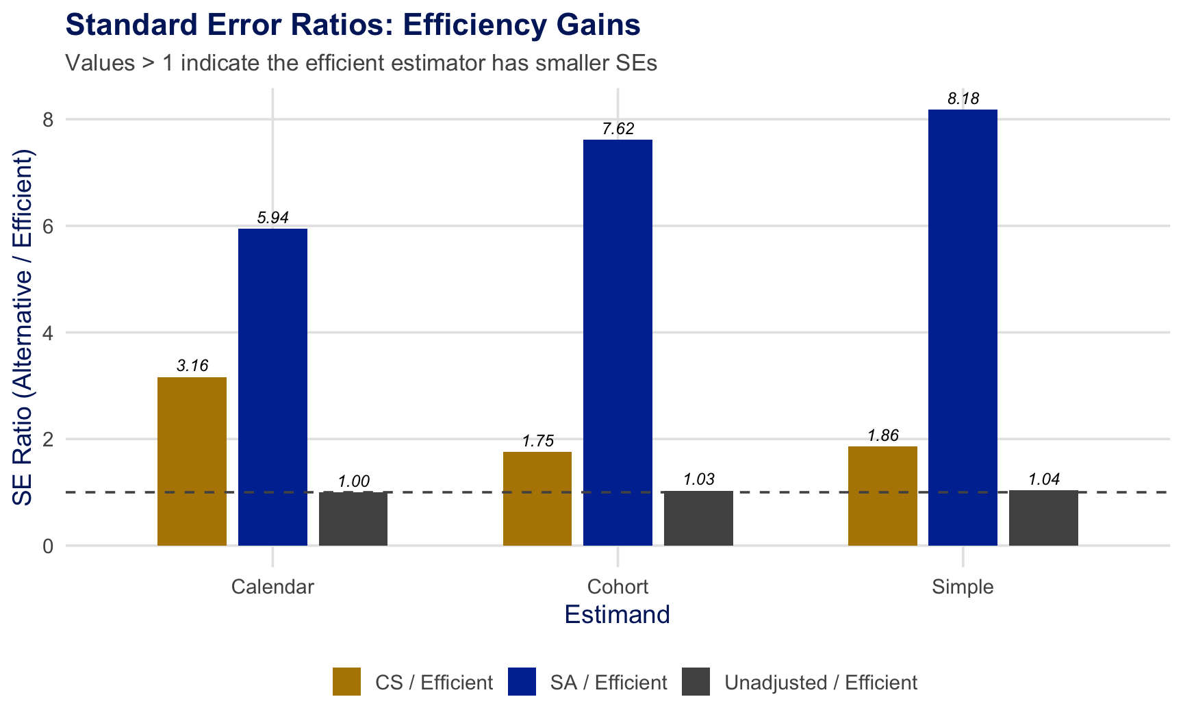 SE ratios \(>1\) indicate the efficient estimator has smaller standard errors.