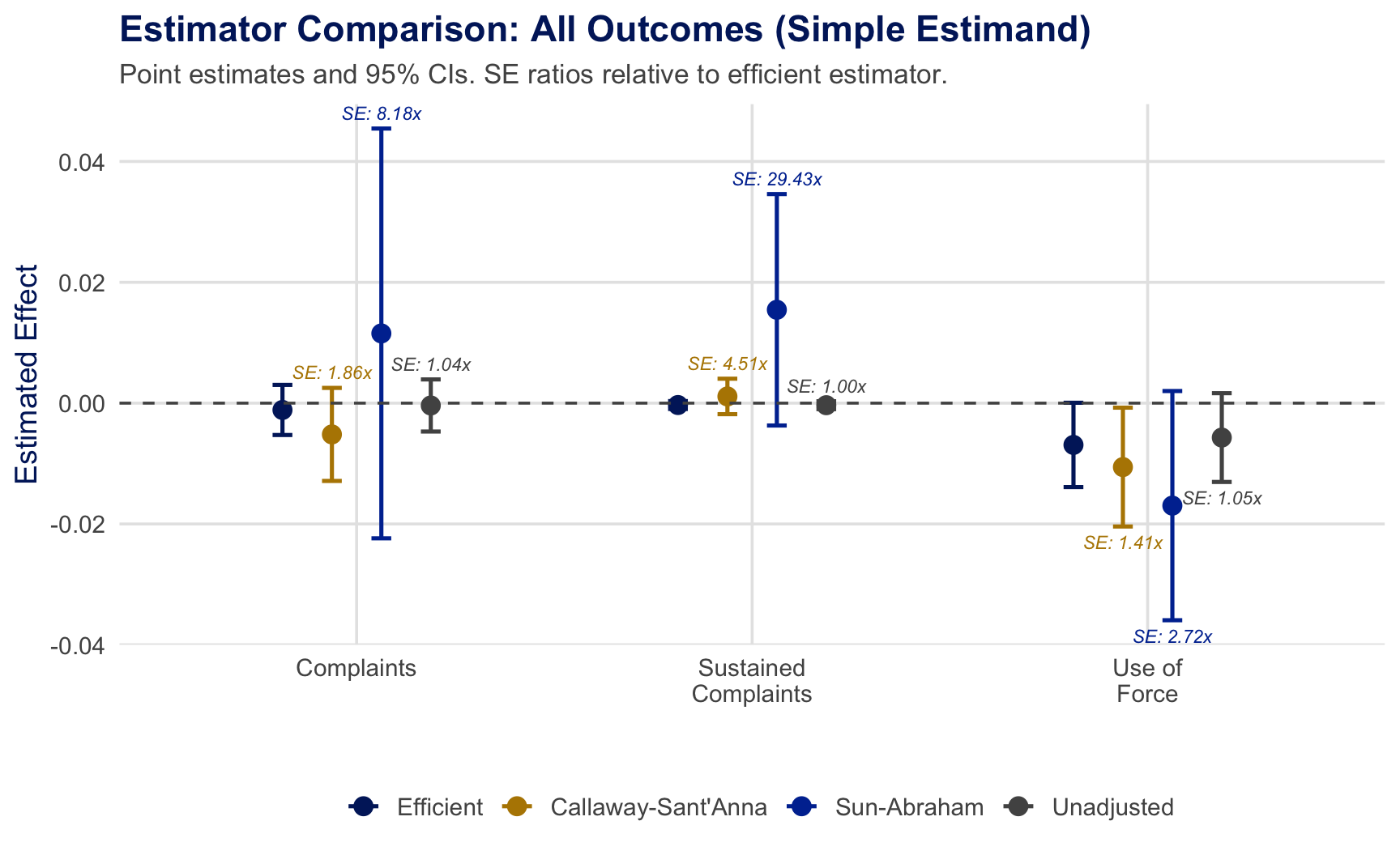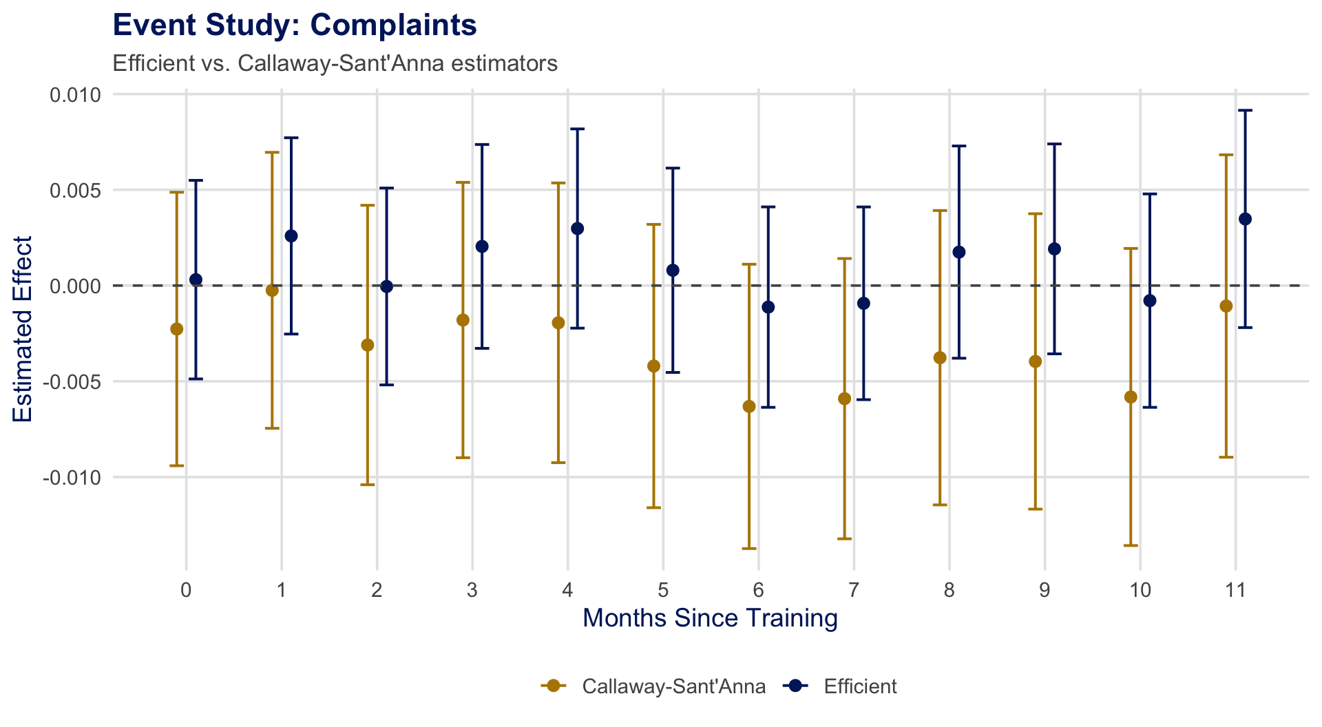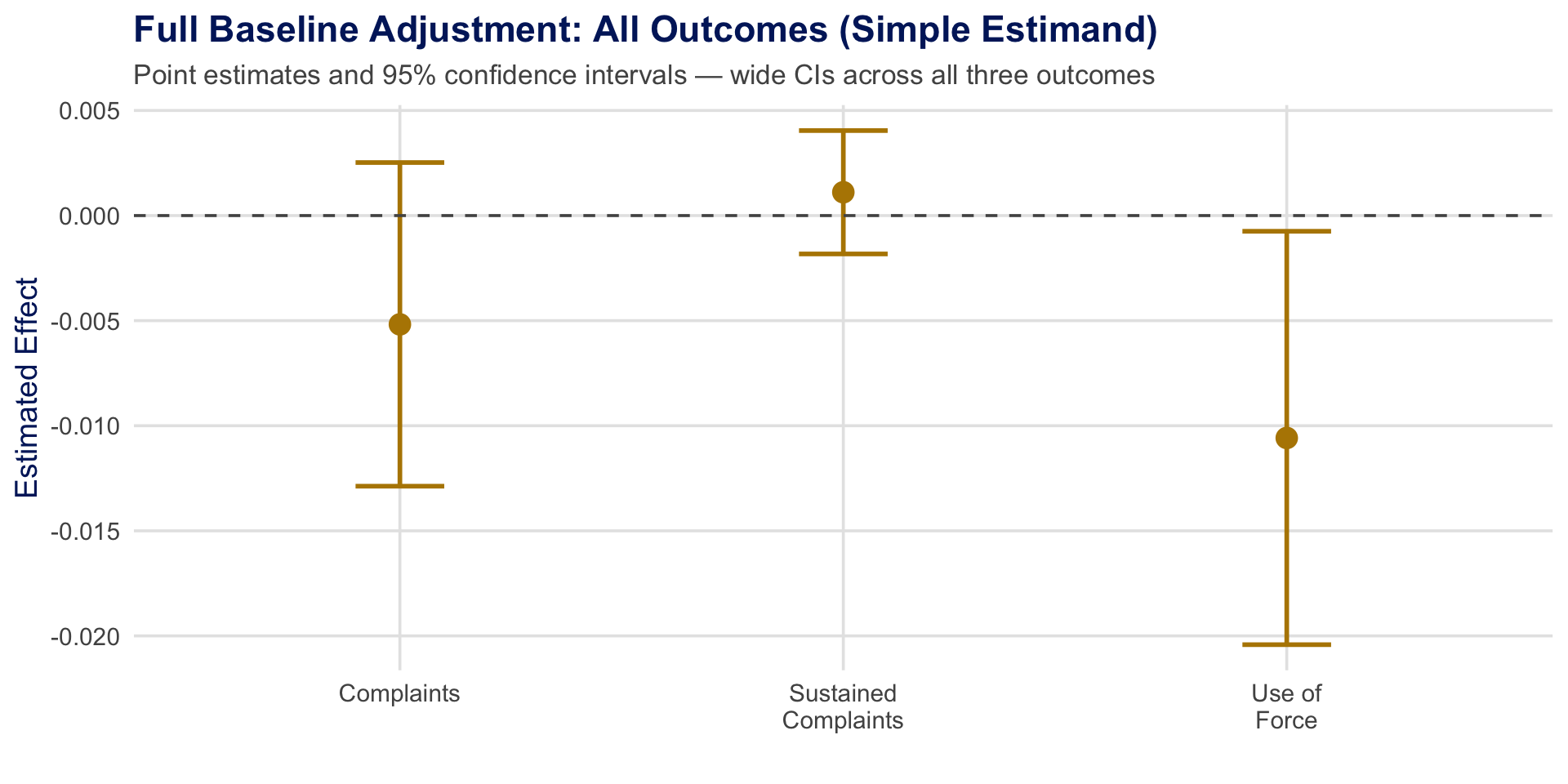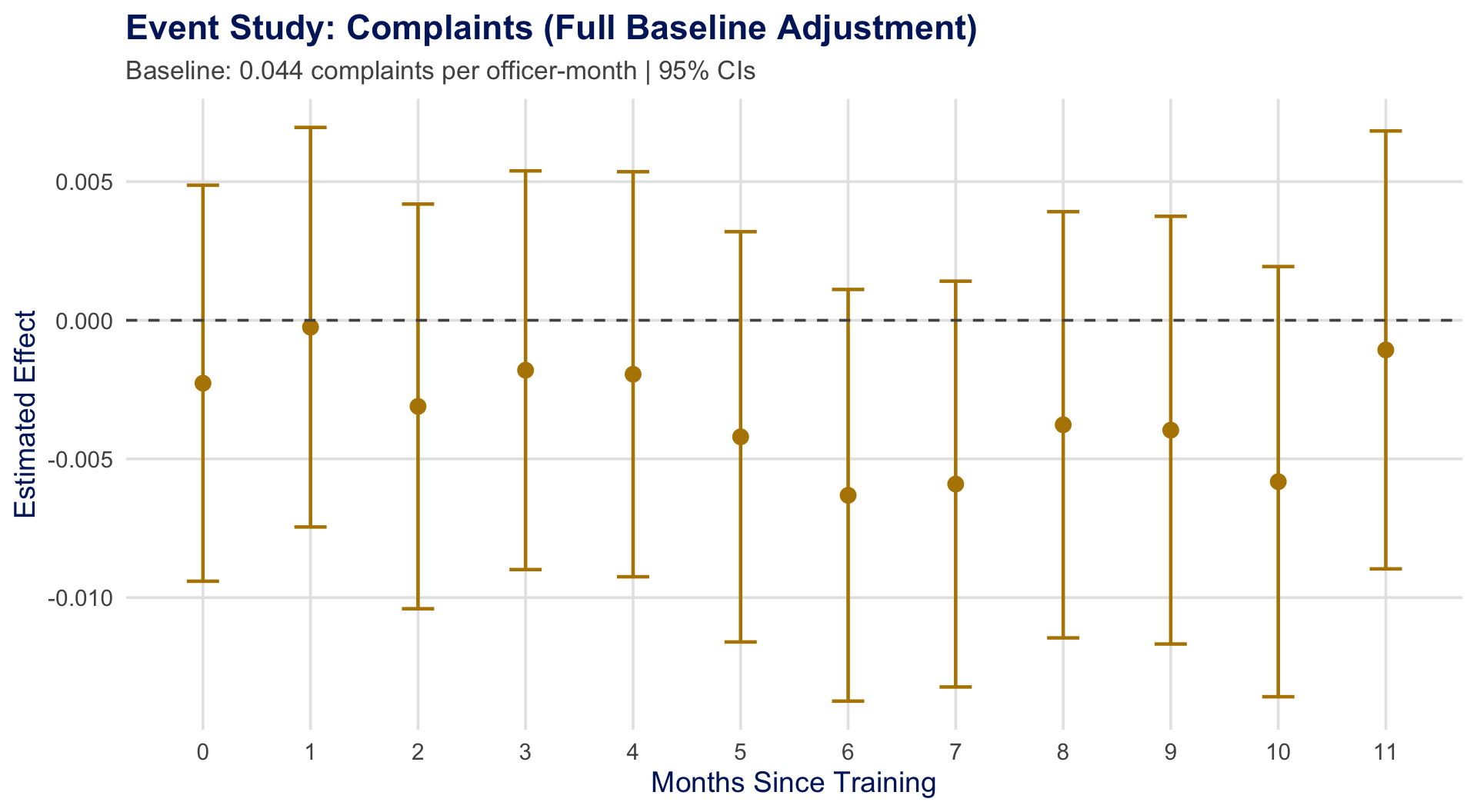 Officers averaged 0.044 complaints/month before training. Estimates suggest \(\approx 11\%\) reduction — but confidence intervals are wide.