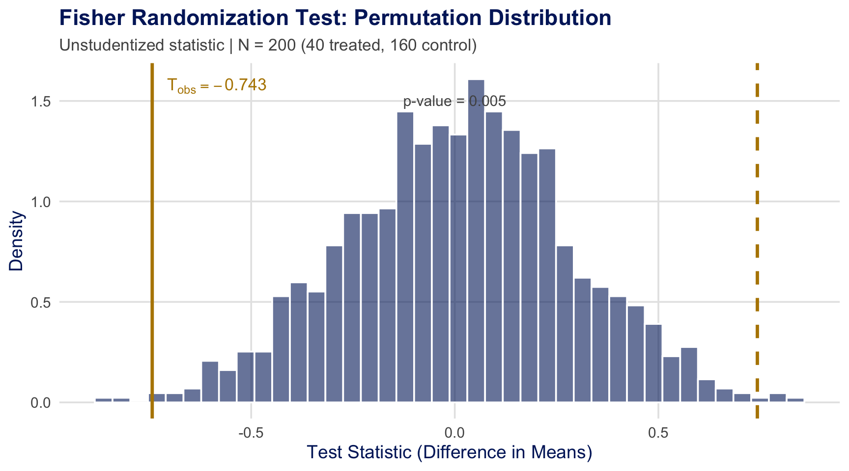 | Inference | Studentized FRT: exact under sharp null, valid under weak null (Prop. 2.3) |