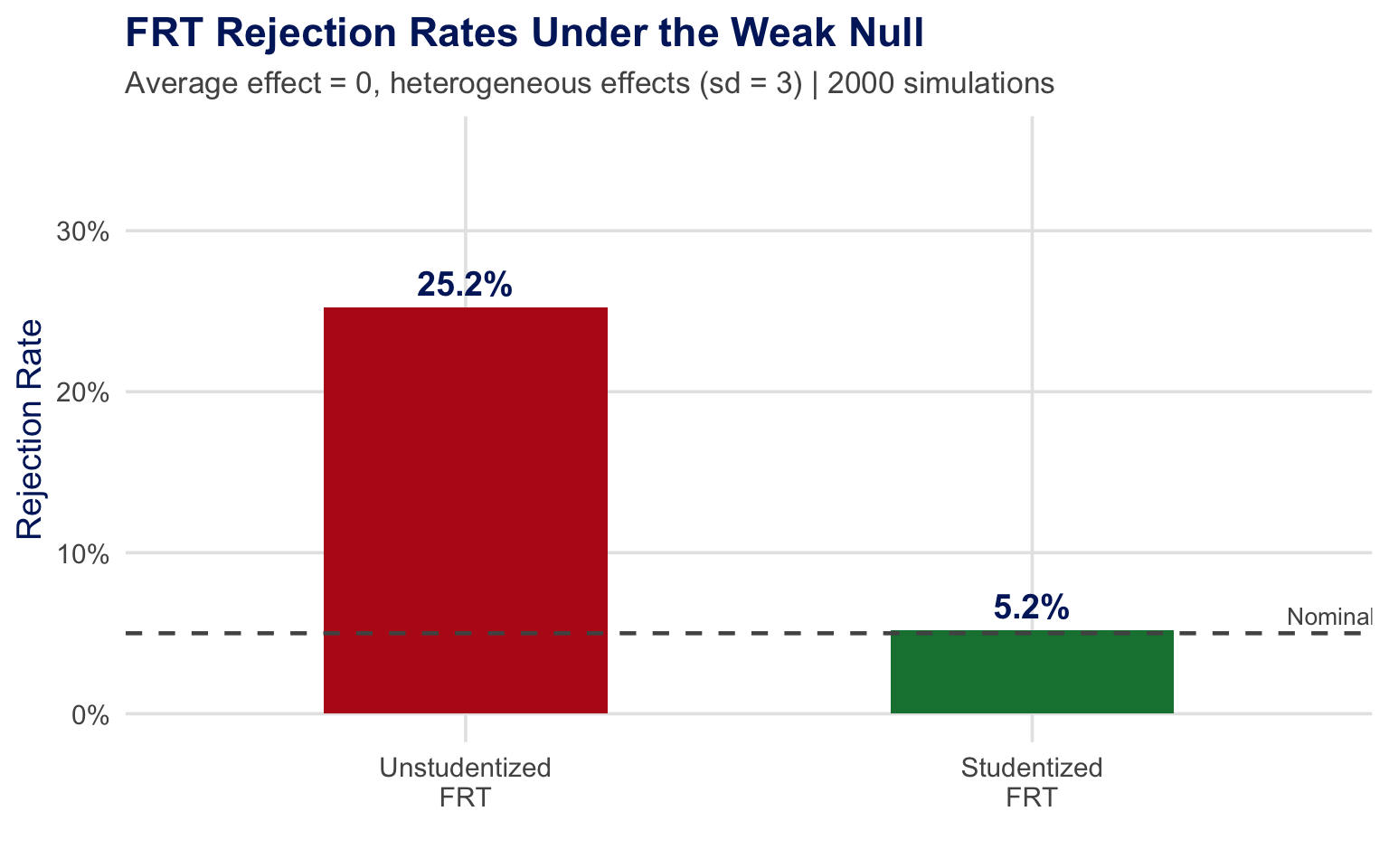 This simulation demonstrates why studentization is essential for FRTs under the weak null. Key DGP: heterogeneous treatment effects with unequal group sizes create variance asymmetry that the unstudentized FRT fails to account for.